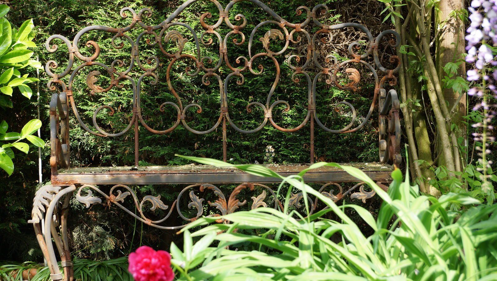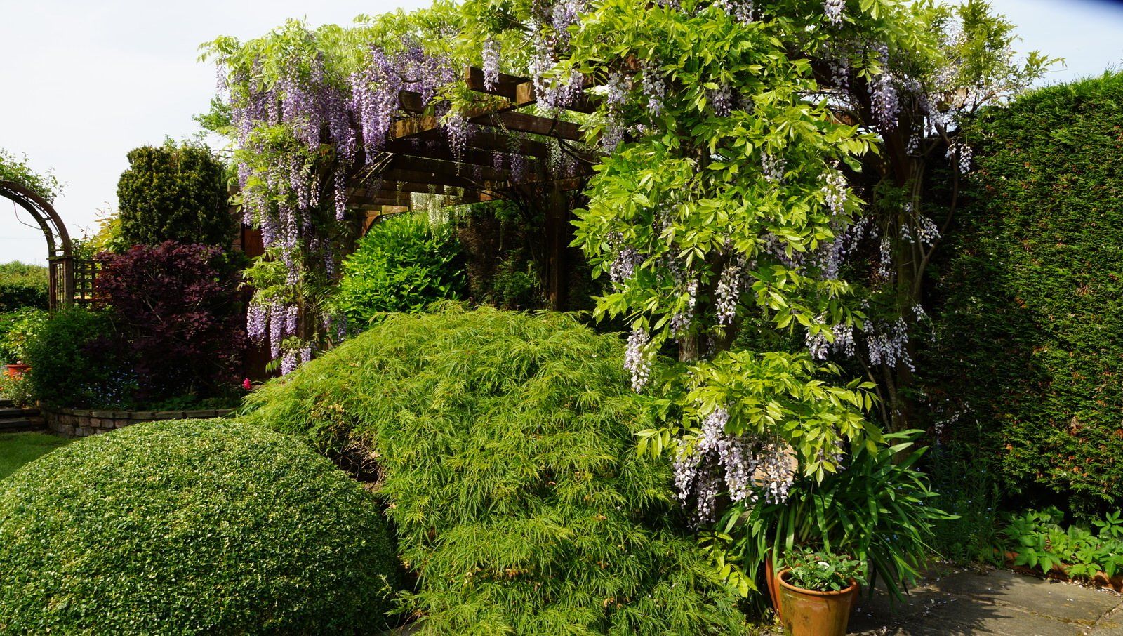 This garden has many elements of the classic 'English Cottage Garden' with small connecting compartments, each filled with its own features. A wisteris covered pergola walkway leads to a garden office. A small bridge crosses the water feature to a small lawn and borders then through the rose arch to another retreat with raised vegetable beds and a storage shed. It was designed and built in its entirity by Malcolm Saul at his home!