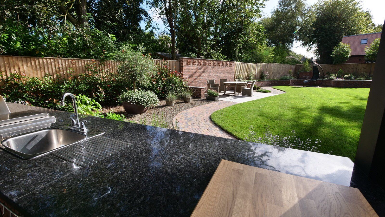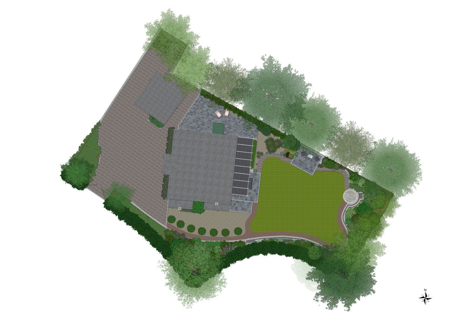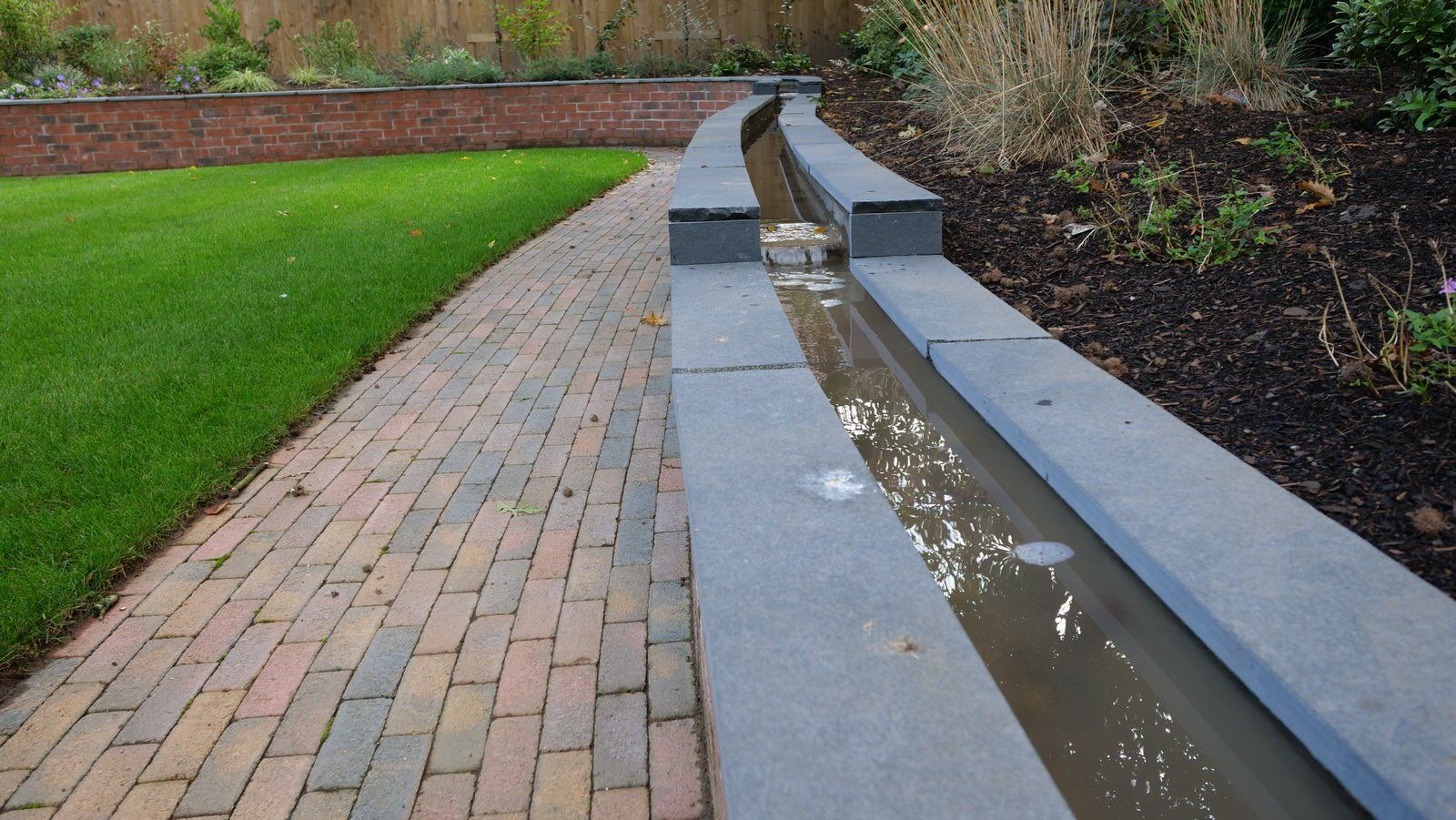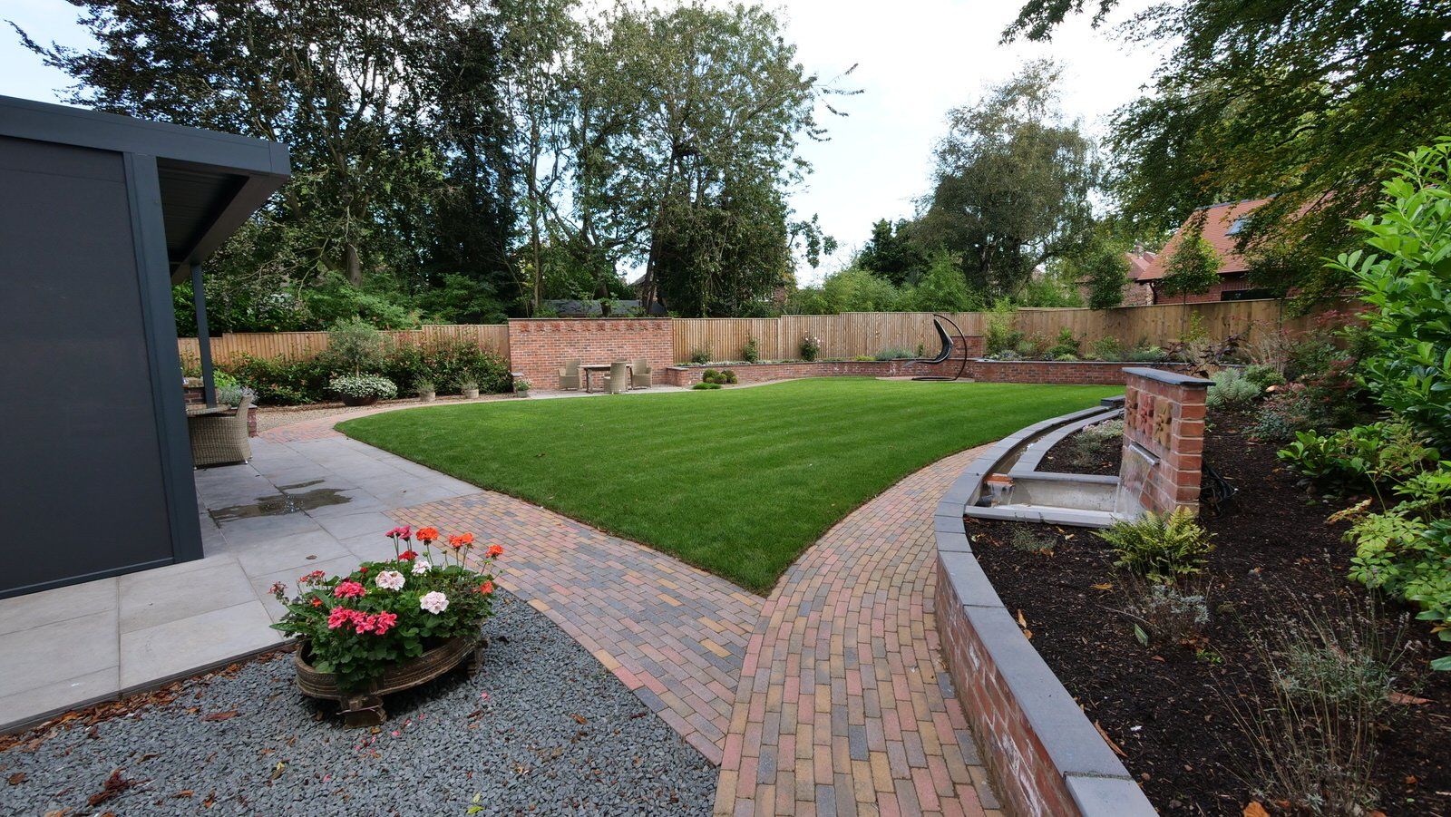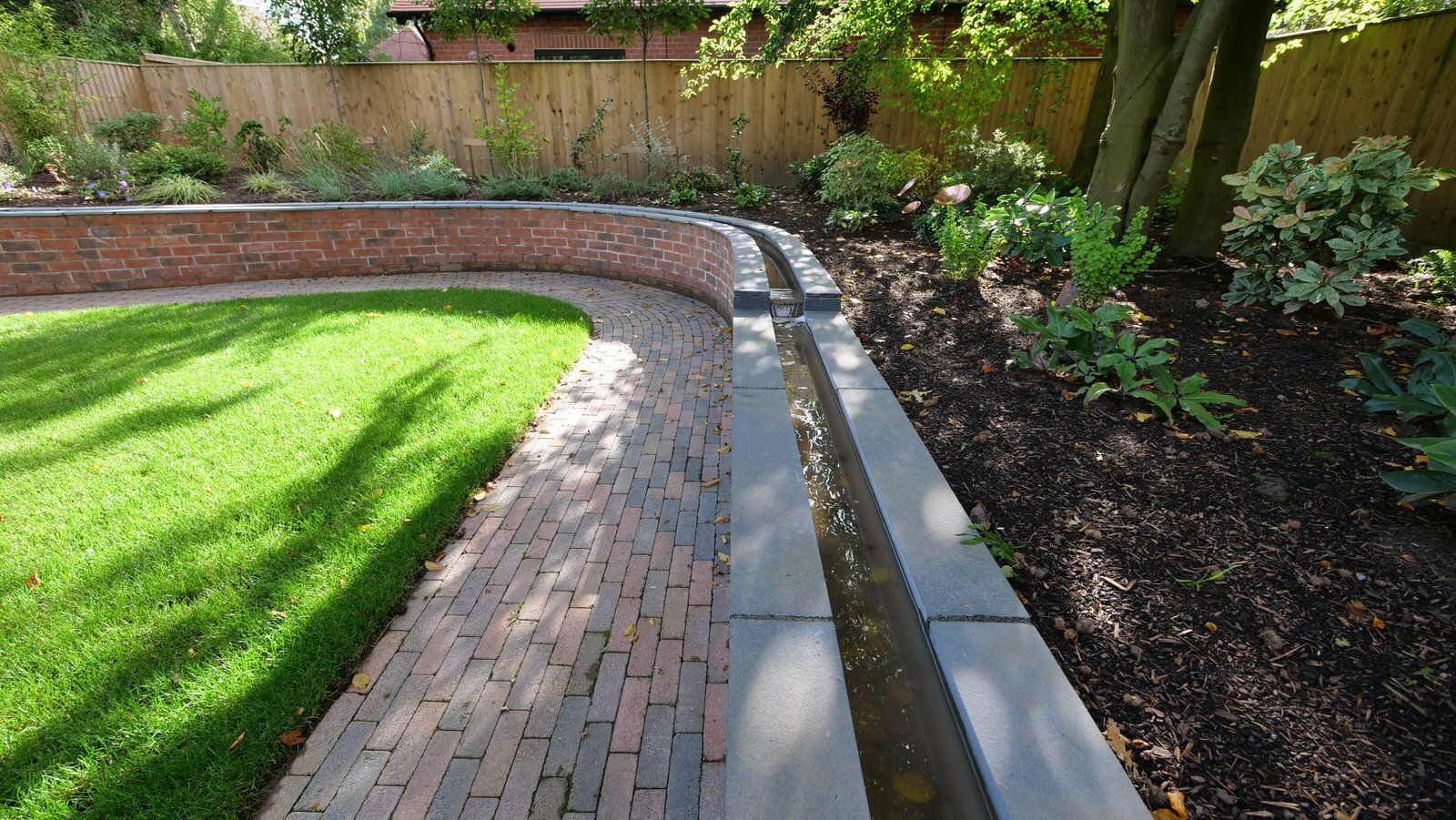 This project involved the demolition of an existing house and site clearance carried out by the main contractor. Prior to that, The Green Styling Company produced outline garden design ideas which were refined through regular consultations with the client. The garden was designed and planned in 2D and 3D to include all the main features including an unusual wall-top rill (stream) water feature, garden lighting, hard and soft areas.