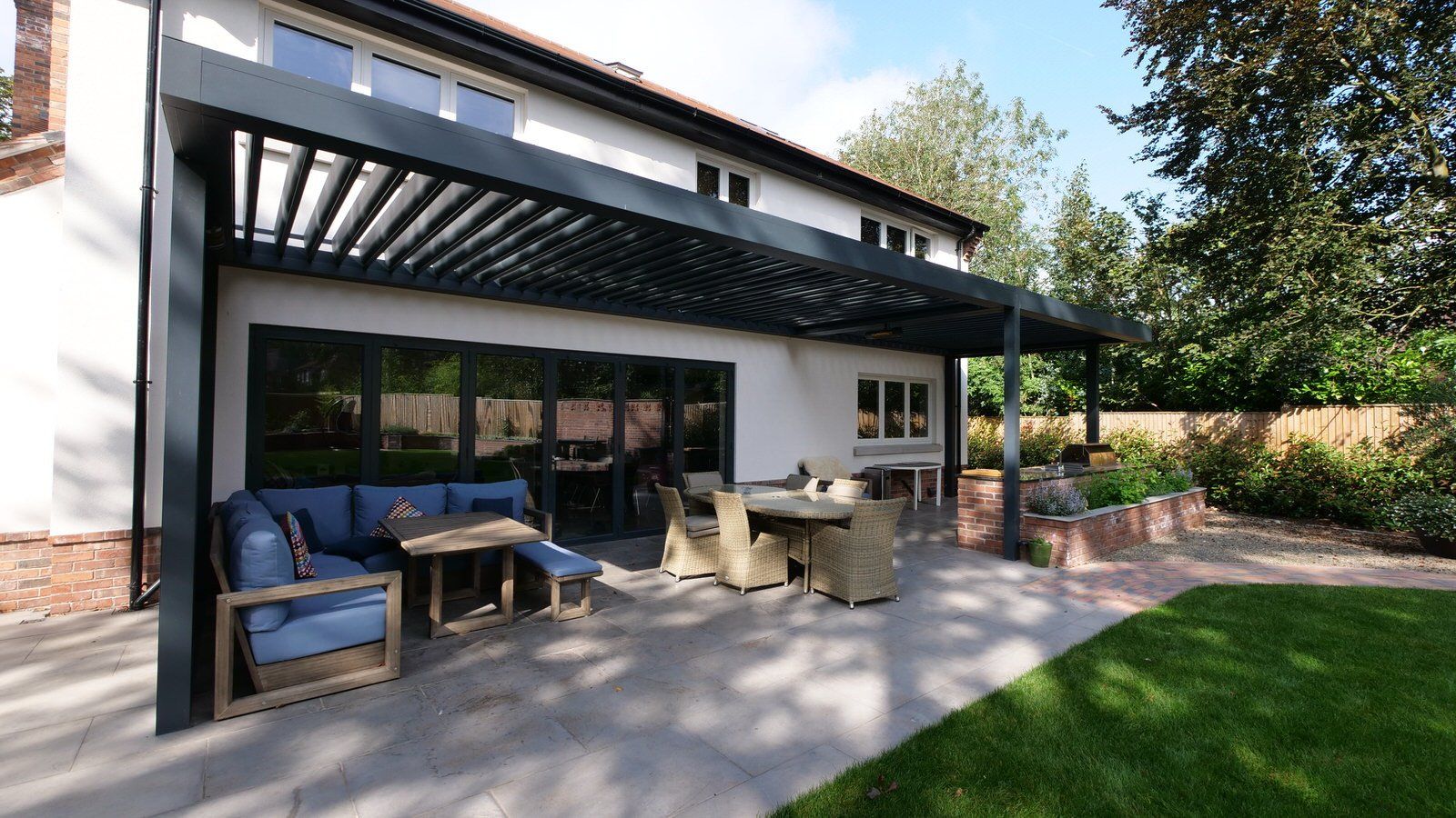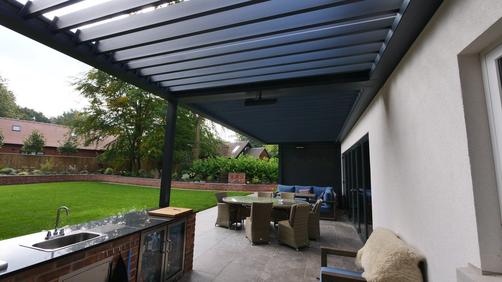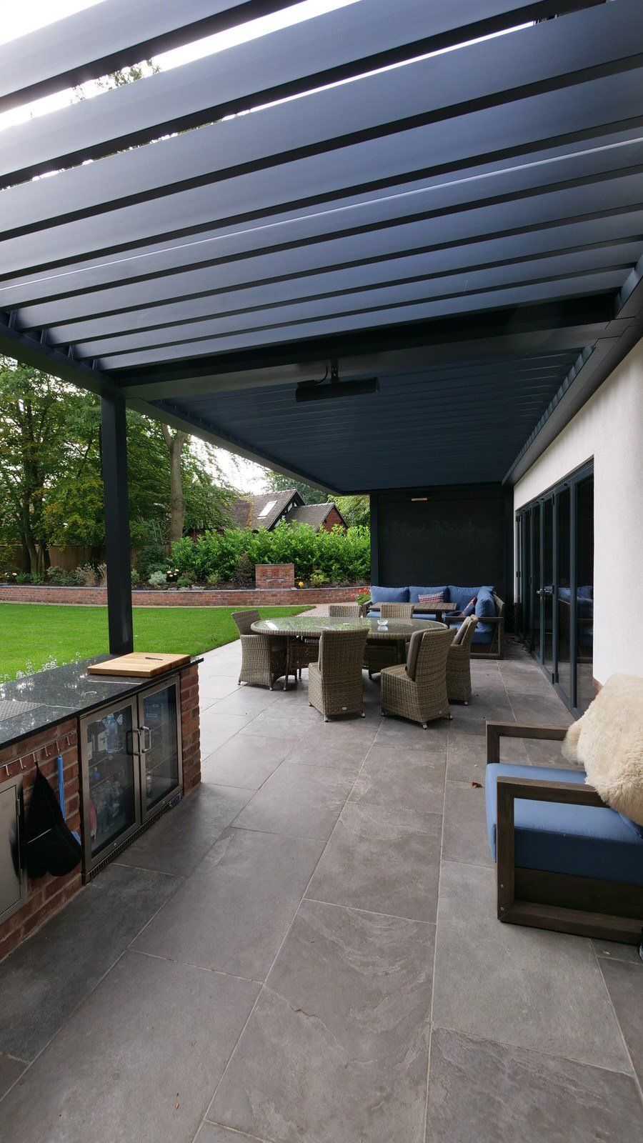 This beautiful outdoor kitchen was part of our overall garden design and provides this elegant new-build house with an all-weather outdoor cooking, leisure and entertaining area. A louvered outdoor living pod provides open cover but with retractable side blinds to add shelter on windy days.