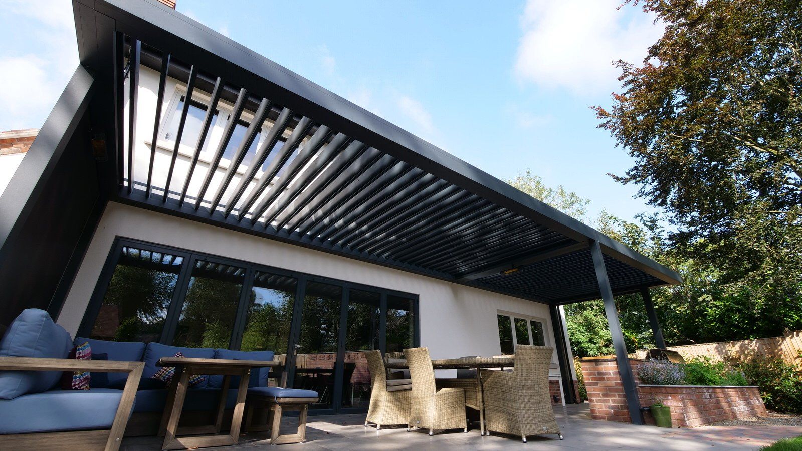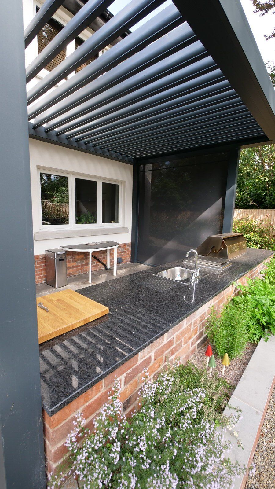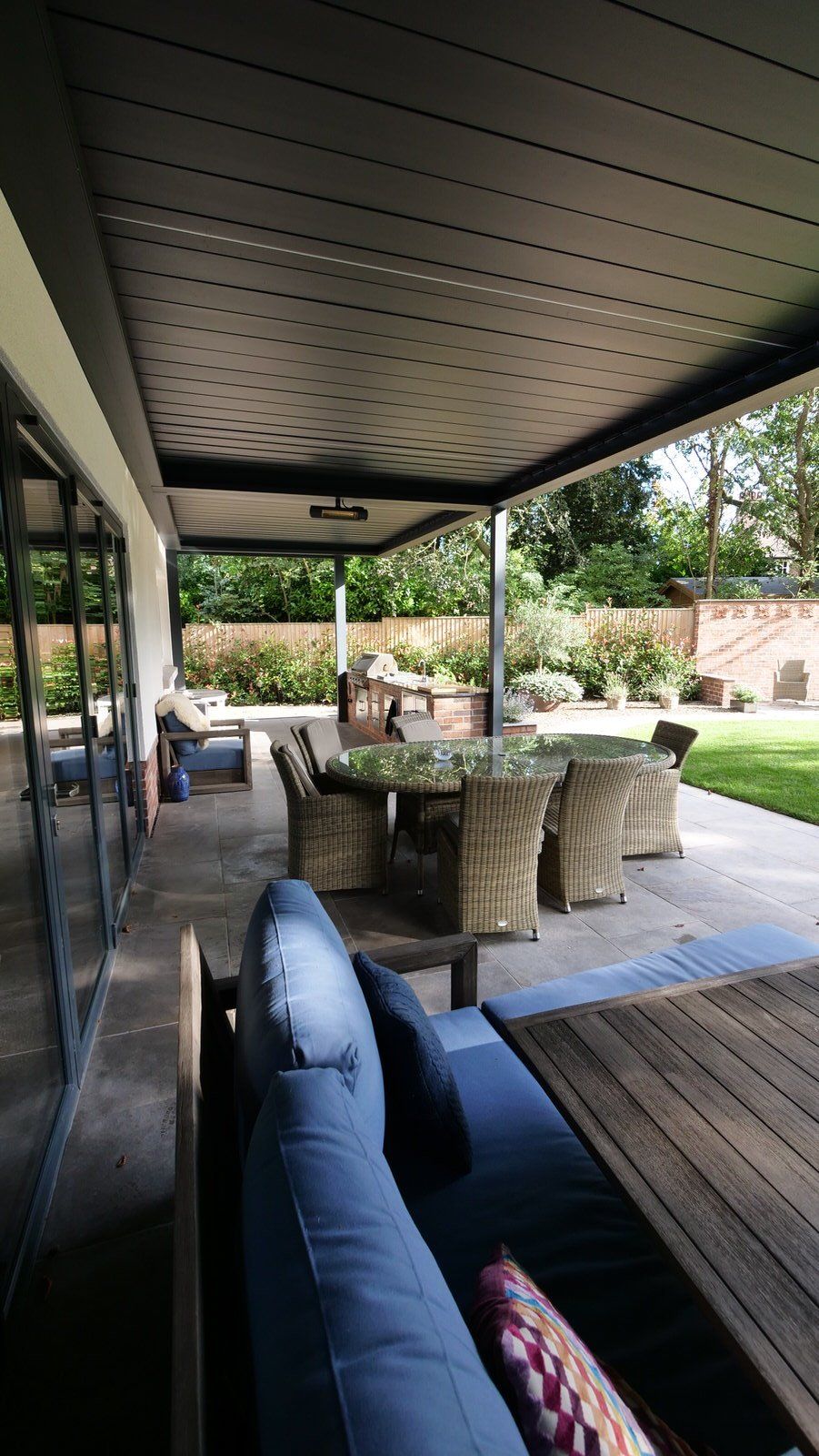 This beautiful outdoor kitchen was part of our overall garden design and provides this elegant new-build house with an all-weather outdoor cooking, leisure and entertaining area. A louvered outdoor living pod provides open cover but with retractable side blinds to add shelter on windy days.