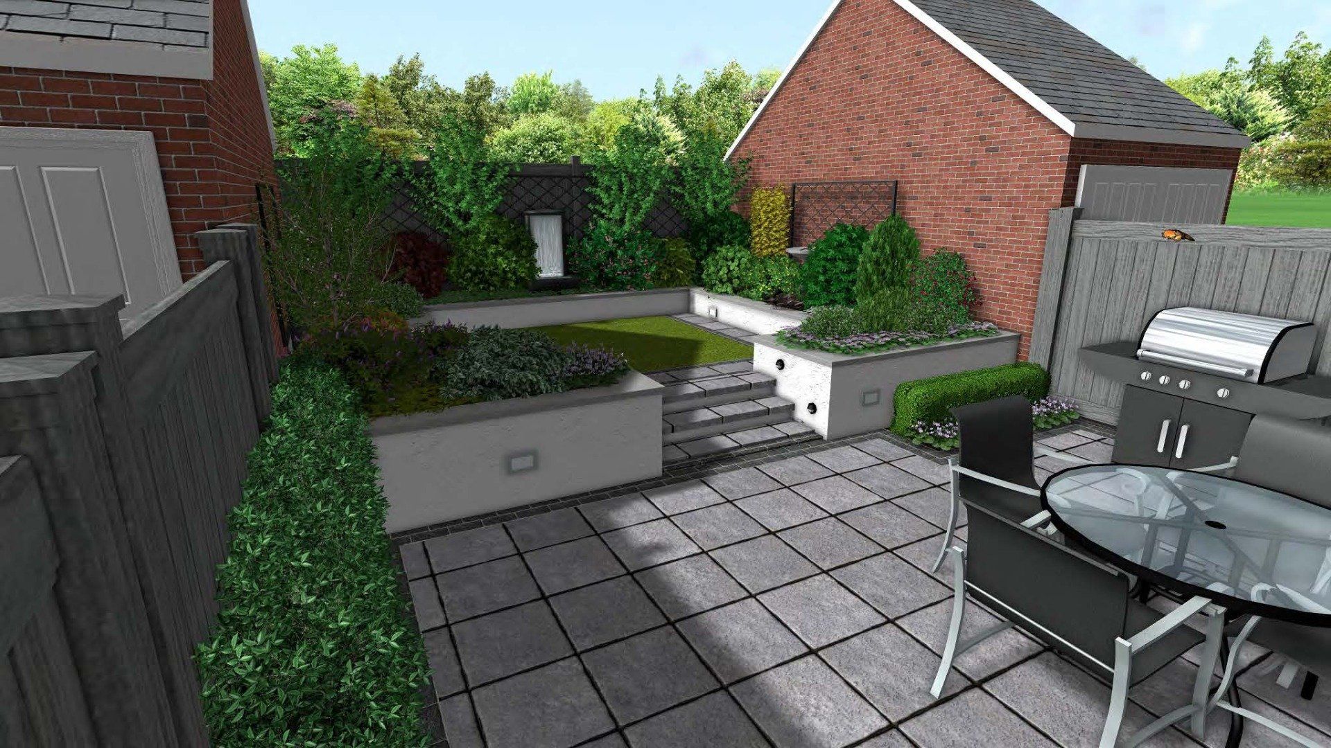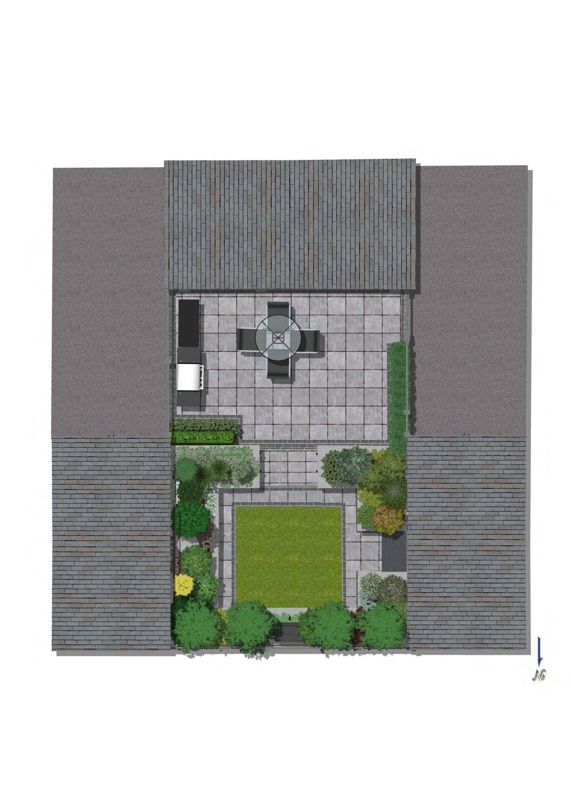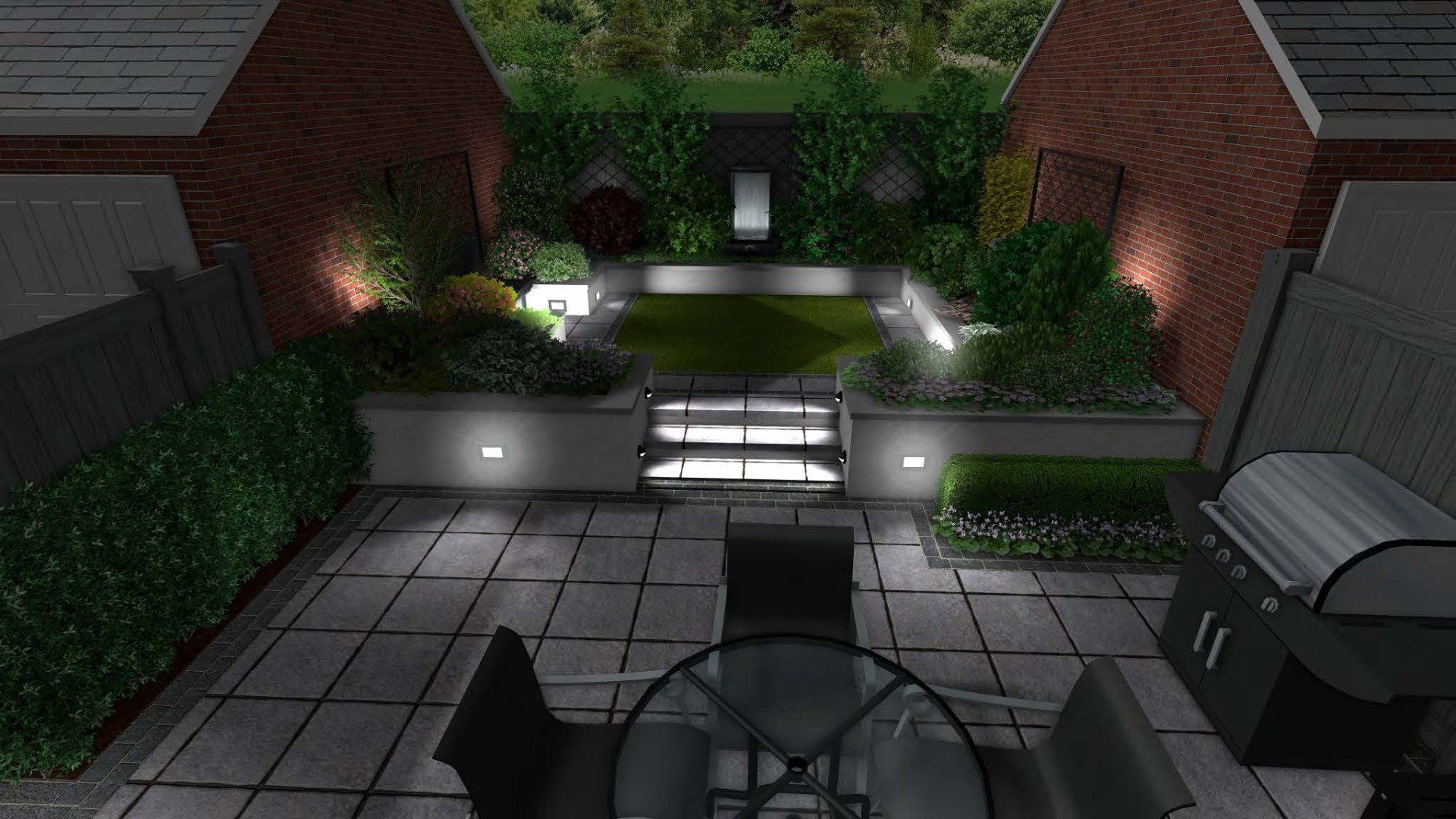 This project called for a strong, modern design with a high quality ceramic garden floor to create geometric shapes and styles. A barbecue and spa area was designed in with outdoor lighting and a horizontal timber clad fence to enclose the area. This included concealed space for bins and log storage. Two more patio areas were added at the side of the house to follow the sun and the corner beds and box topiary/hedging created strong outlines. Small traingular corner beds softened areas by the patios and garden lighting illuminates the whole area with pools of light and accents.